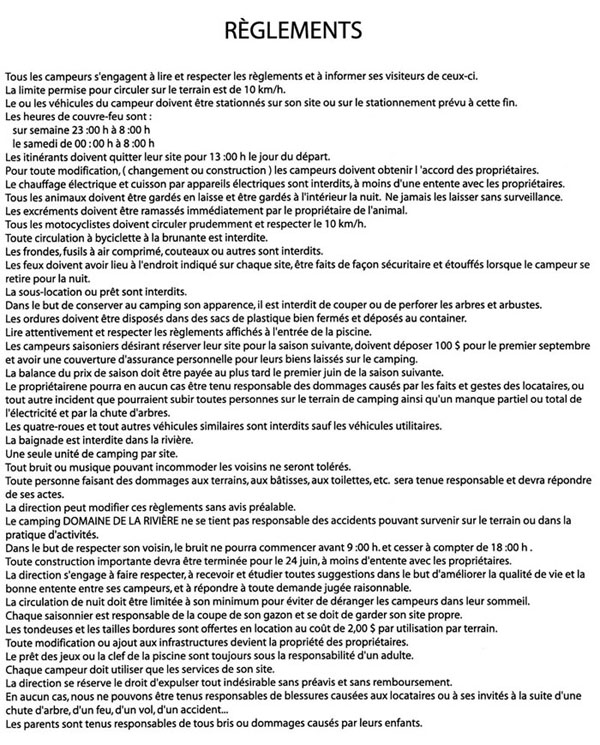 INDEX - BIENVENUE- WELCOME - MAP - PLAN DU TERRAIN - TARIFS - CHALETS / COTTAGES - SERVICES - ALBUMS DE PHOTOS - ACTIVITÉS - RÈGLEMENTS - RÉSERVATIONS